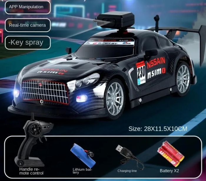 Masina cu telecomanda si APP telefon, camera HD, lumini, pulverizare fum, acumulator inclus, 28x12x10 cm